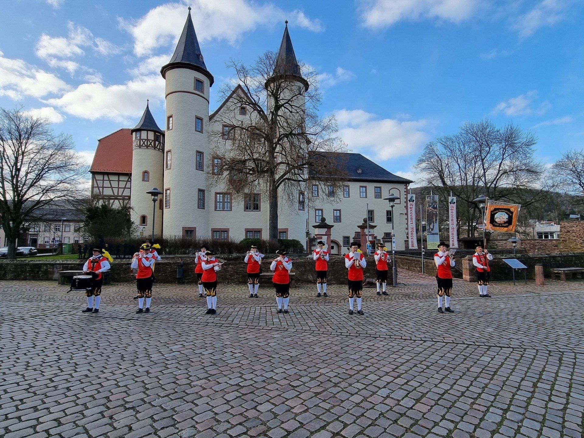 Am Samstag den 19.02.2022 war es wieder soweit, der Spielmannzug der Kolpingsfamilie Lohr warf sich, zum ersten Mal seit zwei Jahre in einer kleinen Besetzung, in die traditionelle Landsknechtsuniform und marschierte durch die Lohrer Altstadt. Auf dem Lohrer Schlossplatz gab es bei strahlendem Sonnenschein ein kleines Standkonzert. Die Karnevalsklänge lockten spontan viele Passanten an, man hörte von links und rechts die Narrenrufe „Helau“ . Die Leute klatschen und schunkelten. Die Stimmung bei uns Musikern und den Passanten war großartig.