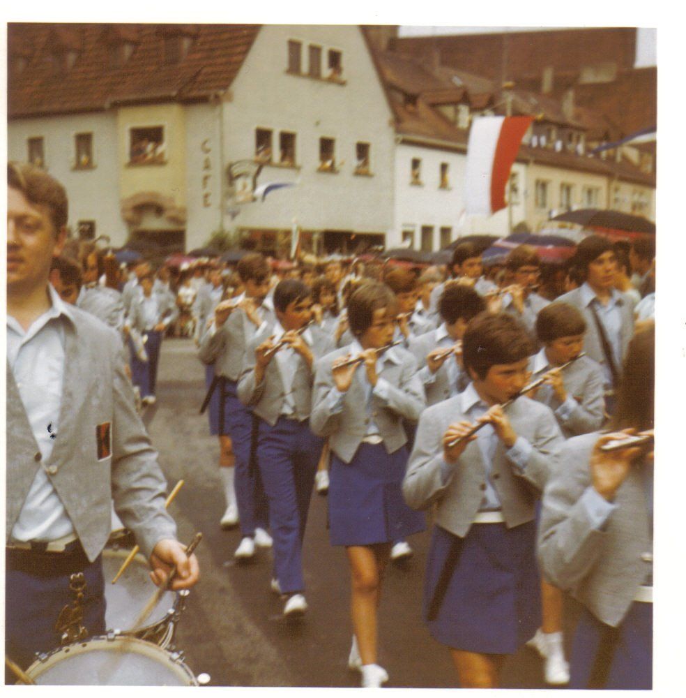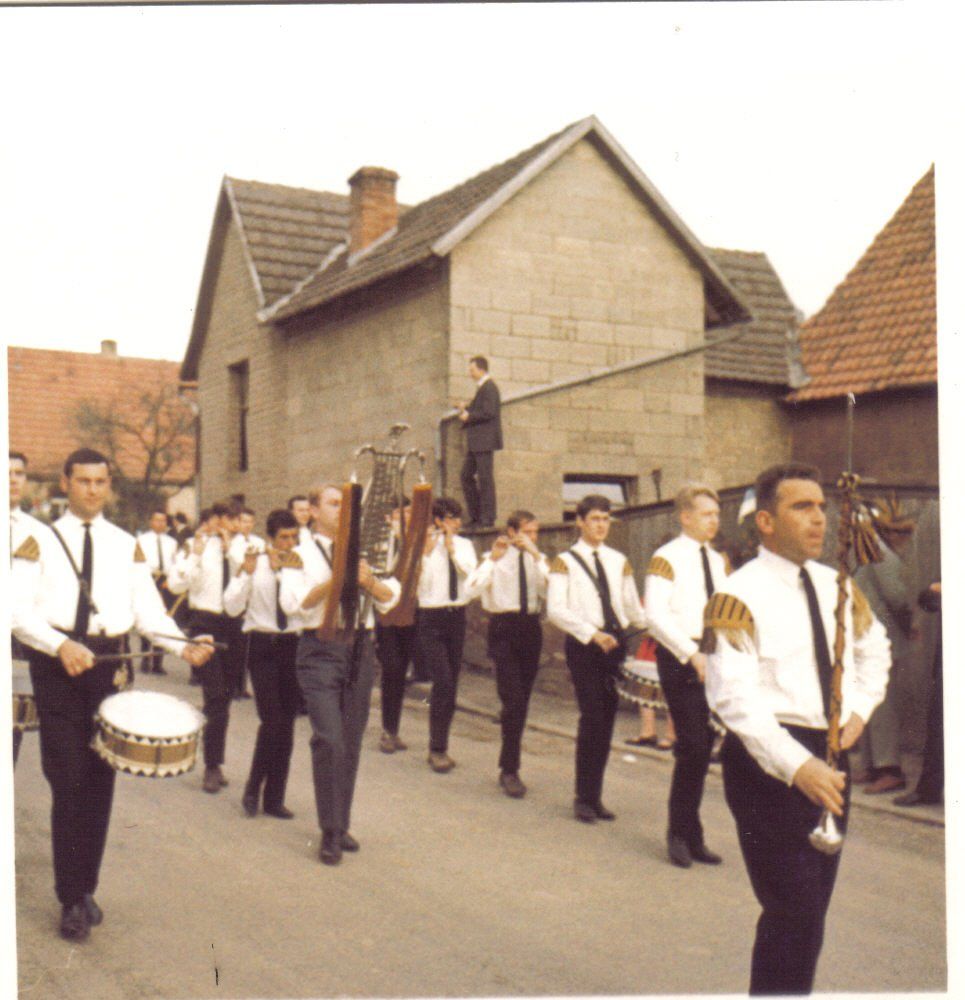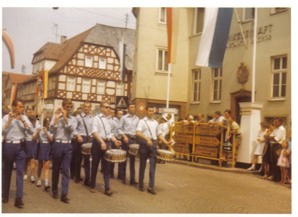 Ab 1959 begleitete man das jährliche Transportfliegertreffen in Lohr musikalisch, u.a. mit dem frühmorgendlichen Weckruf. Im Laufe der Jahre wurden 2 Lyren und schicke Uniformen angeschafft. Blaue Hosen bzw. Röckchen, graue Jacken mit Kolpingabzeichen, blaue Hemd mit Schleife und weiße Turnschuhe. Aus der kleinen Schar entwickelte sich ein stattlicher Zug, damals mit einer Spielstärke von ca. 50 Musizierenden. Es wurde zwischenzeitlich in einer Tüncherwerkstatt beim Franze Jupp oder in der Schreinerei beim Kunkels Walter geprobt. Als Musiklehrer fungierten Herr Bartoschek und später Herr Reichel.