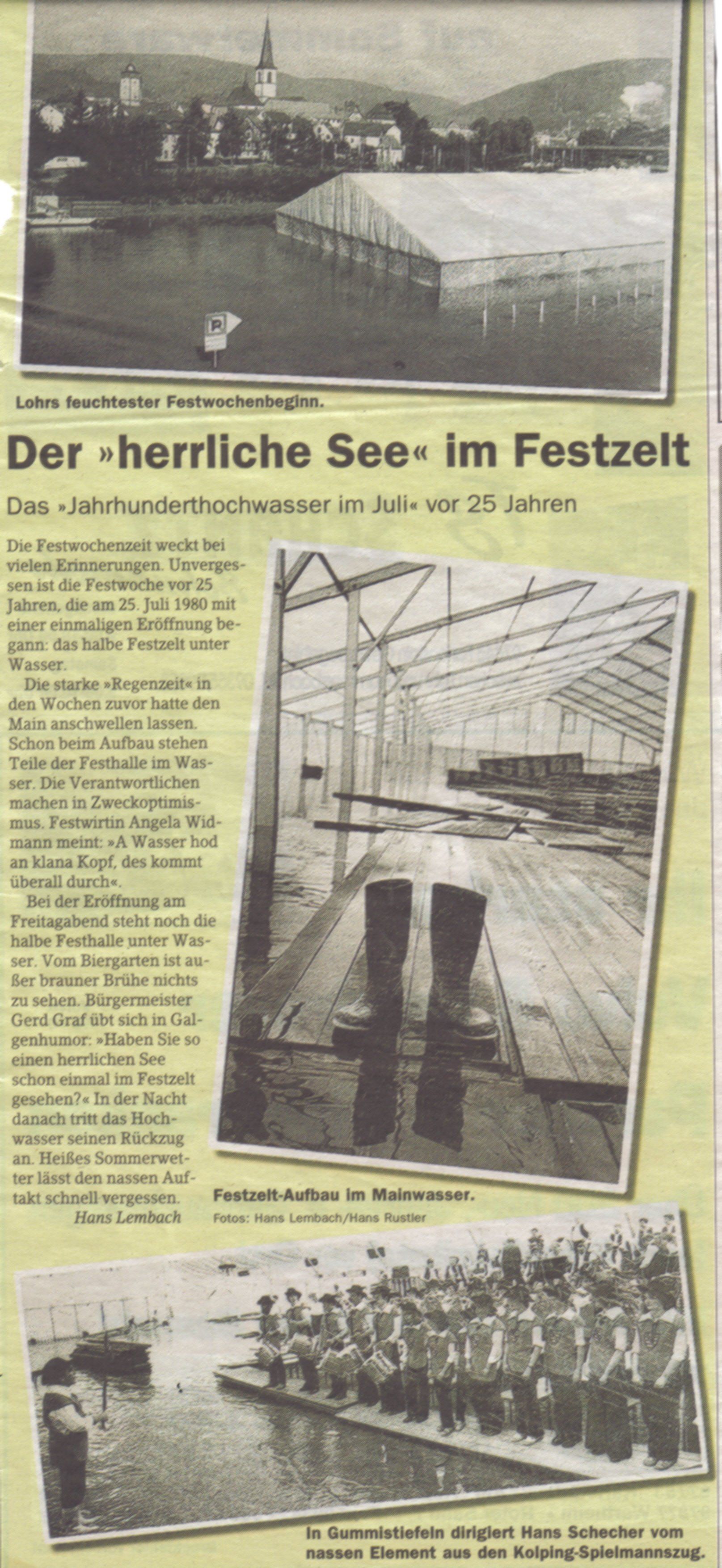 Zur Eröffnung der Spessartfestwoche 1980 dirigierte Hans Schecher in Gummistiefeln, in einem vom Hochwasser überfluteten Festzelt.